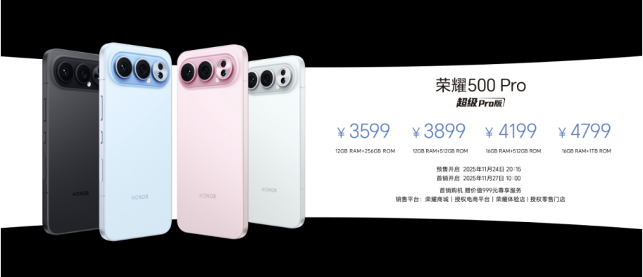 榮耀500系列共帶來“海藍寶”、“星光粉”、“月光銀”、“曜石黑”4款水晶配色,售價方面,榮耀500標準版12GB+256GB、12GB+512GB和16GB+512GB版本售價分別為2699元、2999元和3299元;榮耀500 Pro版12GB+256GB、12GB+512GB、16GB+512GB和16GB+1TB版本售價分別為3599元、3899元、4199元和4799元。現已在榮耀商城、授權電商平臺、榮耀體驗店、授權零售門店開啟預售,并于11月27日10:00正式開售,首銷購機贈價值999元尊享服務。
