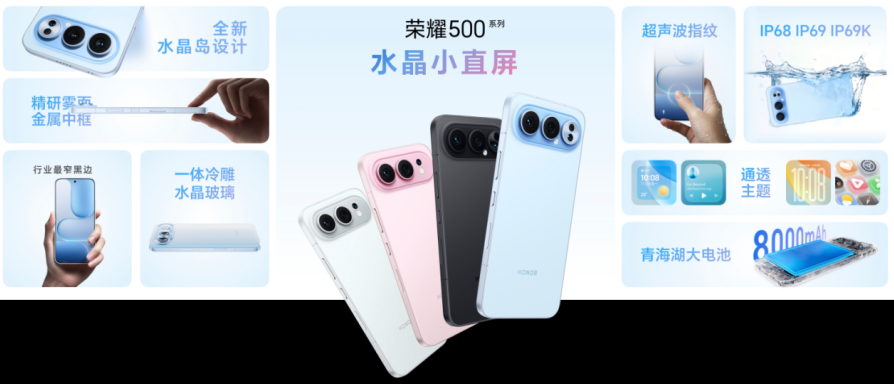 此外,新機支持IP68&IP69&IP69K行業至高防水等級,可靠性全面進階。榮耀500 Pro還配備旗艦同款超聲波指紋,濕手秒解,響應迅速,在細節處彰顯旗艦級品質。